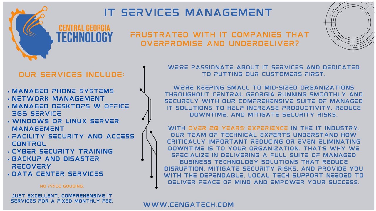 Central Georgia Technology, LLC based in Peachtree City, has been in business since 2017. We are a Technology Managed Services Provider specializing in Business Class Phone Services, Security Cameras, Access Control Systems, Network Management, Computer Management, and Office 365 License Management. Security is at the core of all of our solutions. Our mission is to help small to mid-sized businesses and non-profit organizations keep their core technology up and running with maximum protection and minimal disruption. We offer tailored monthly and annual fixed rate service plans that align to your budget and deliver good value. All our plans include both phone and onsite support at no additional charge. We have over 150 satisfied customers located throughout Central Georgia.