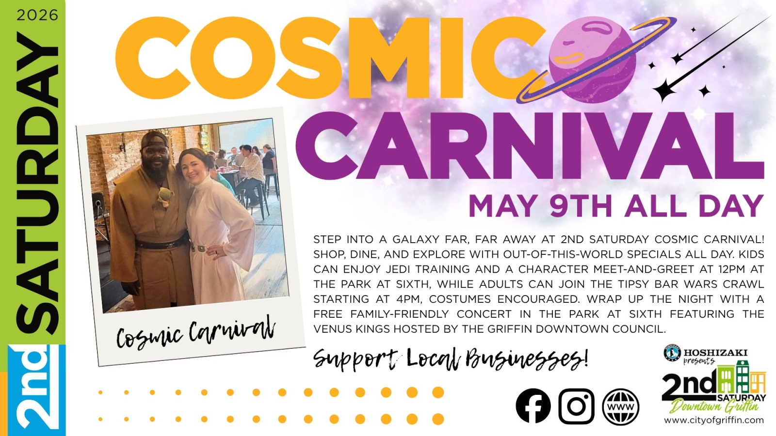 Step into a galaxy far, far away at 2nd Saturday Cosmic Carnival, presented by Hoshizaki America! Shop, dine, and explore with out-of-this-world specials all day. Kids can enjoy Jedi training and a character meet-and-greet at 12PM at The Park at Sixth, while adults can join the Tipsy Bar Wars Crawl starting at 4PM, costumes encouraged. Wrap up the night at The 2nd Saturday Concert Series, a free family-friendly concert sponsored by First National Bank, located in the Park at Sixth, featuring The Venus Kings.