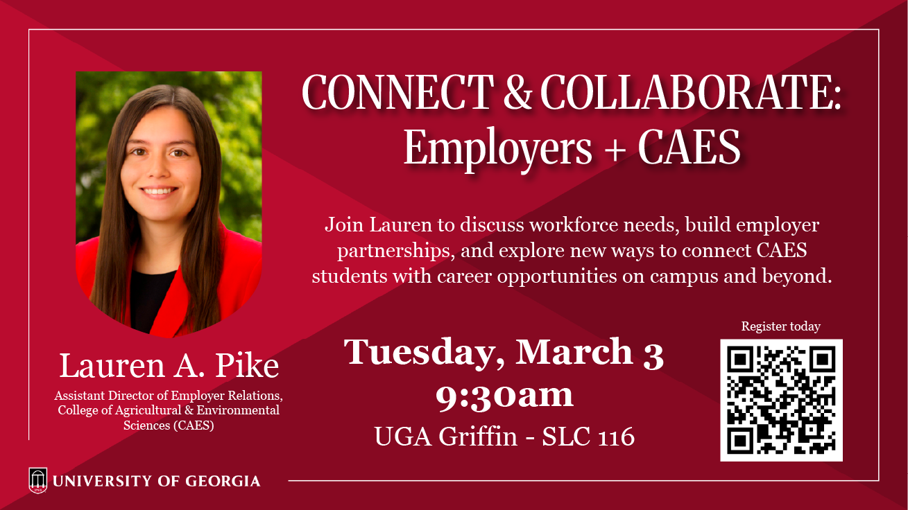 On March 3, the UGA Griffin Campus welcomes Lauren Pike, the new Assistant Director of Employer Relations for the College of Agricultural and Environmental Sciences. Lauren is eager to better understand employers’ workforce needs and explore opportunities to connect them with CAES students, both on campus and post-graduation. Her role focuses on building meaningful partnerships between employers and CAES students to support successful career pathways.